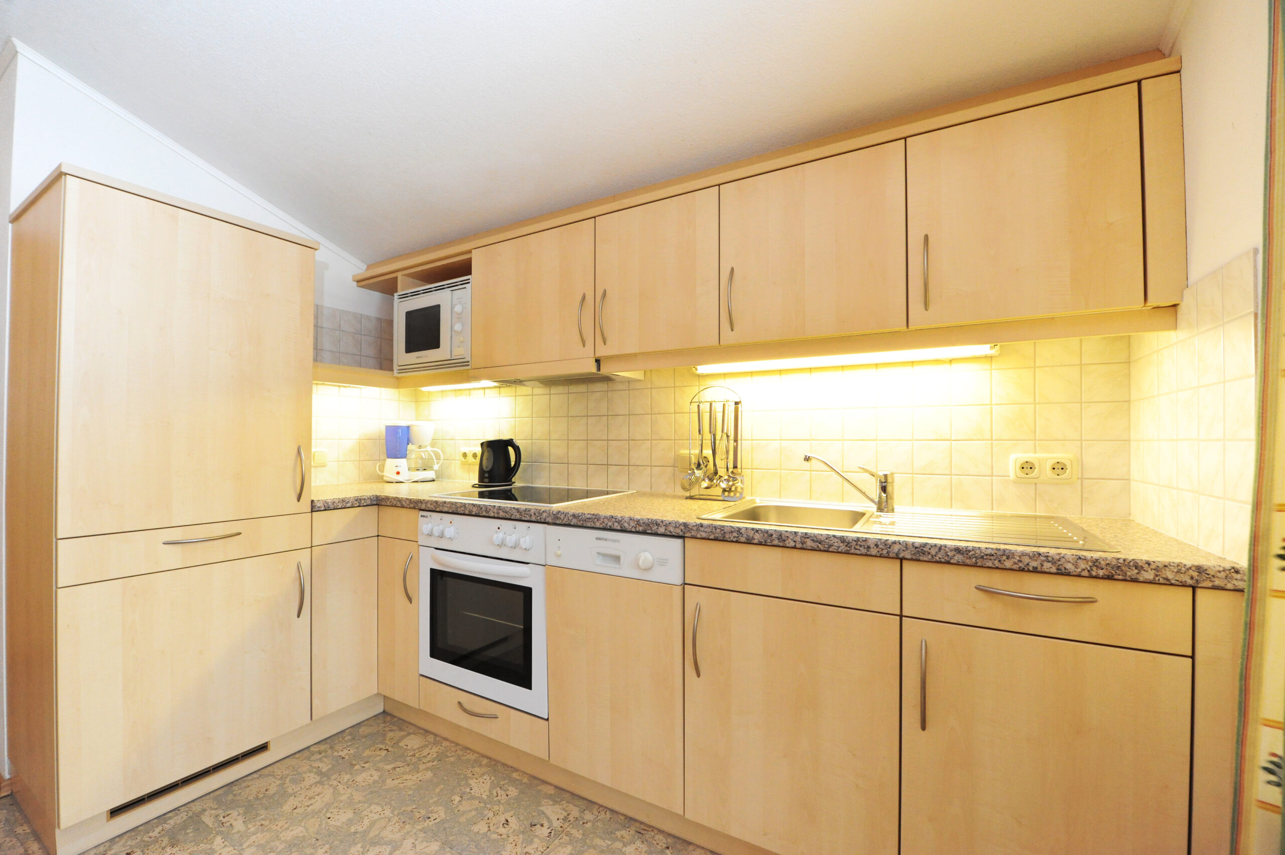 Die Küche ist ausgestattet mit einem Herd, einem Backrohr, einem Kühlschrank, einer Kaffemaschine und einer Mikrowelle. Ein vollständiges Inventar zum Kochen ist vorhanden.