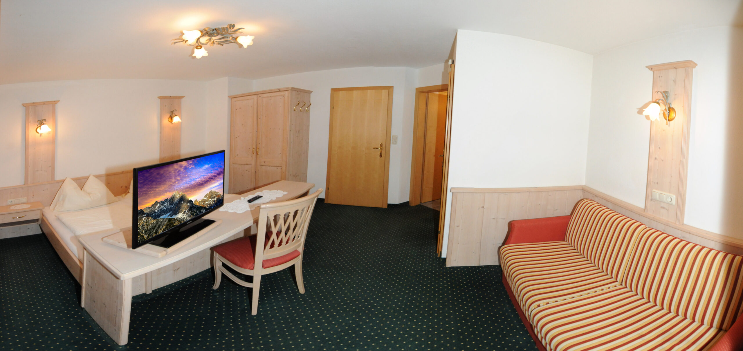 Zimmer 4 ist Bestandteil von Wohnung 1 und kann bei Verfügbarkeit auch separat für 2 - 4 Personen gebucht werden. Das Zimmer verfügt über ein Doppelbett, eine Doppelkomfortausziehcouch mit der Breite 180 cm, ein Badezimmer mit Dusche und ein seperates WC. Bettwäsche ist im Preis inkludiert und alle Betten und die Ausziehcouch sind überzogen. Im Bad werden pro Person 2 Handtücher zur Verfügung gestellt und die Ausziehcouch ist ausgestattet mit einer extra Matratze für perfekten Schlafkomfort. Selbstvertändlich ist auch Kabel TV und W-LAN im Zimmer verfügbar.